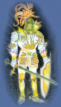 She craned her neck to find out what, or who, was causing them and saw a tall knight, clad in silver-gray armor with a white breastplate upon which was emblazoned a scarlet rose. He had just dismounted from a cream-coated charger and was carrying a long lance and white shield, once again adorned with a scarlet rose, as he strode toward the tethered maiden. His name was George.